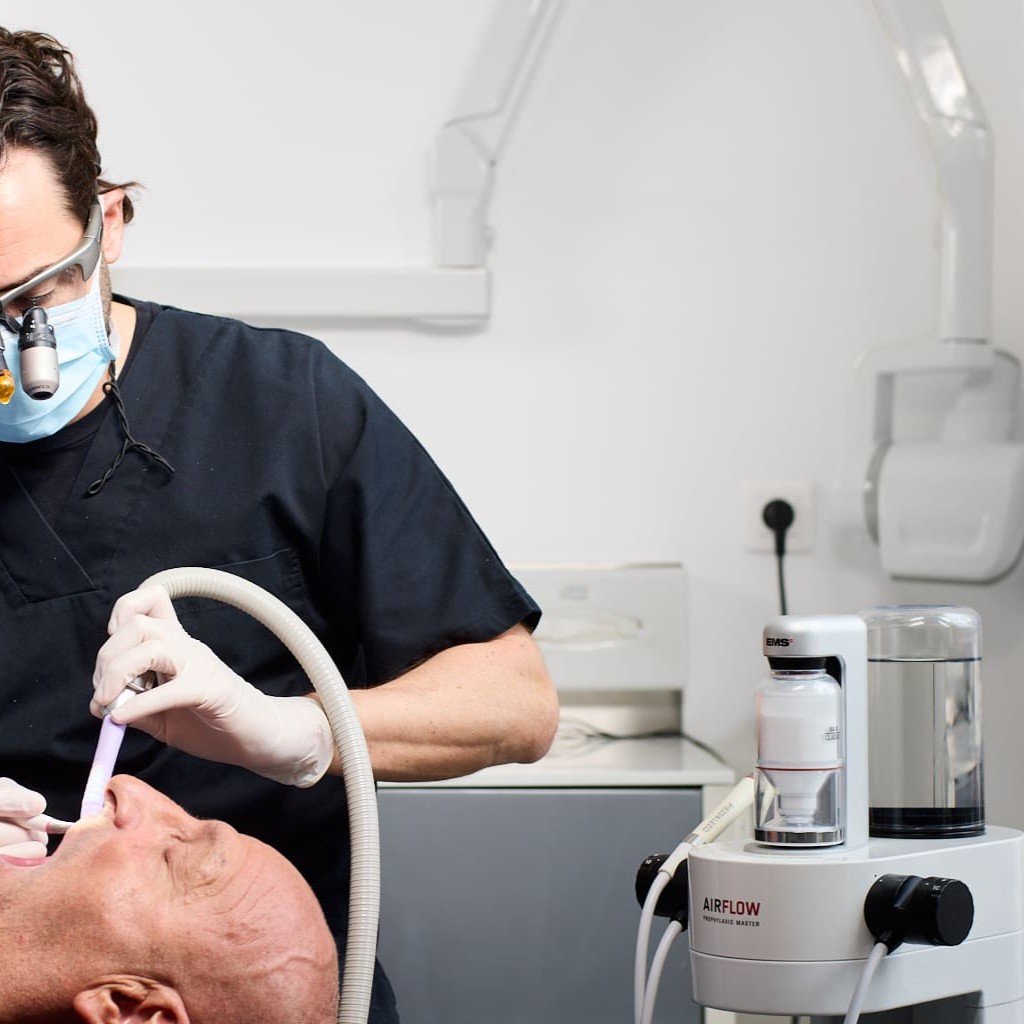 L’Airflow est une technique de prophylaxie qui associe air, eau et poudre fine pour éliminer efficacement la plaque dentaire, les dépôts mous et les colorations liées au café, au thé ou au tabac. Indolore et respectueux des tissus, il permet de nettoyer les zones difficiles d’accès tout en offrant une sensation de fraîcheur immédiate. Cet outil contribue non seulement à l’esthétique du sourire mais aussi à la prévention des maladies parodontales.
